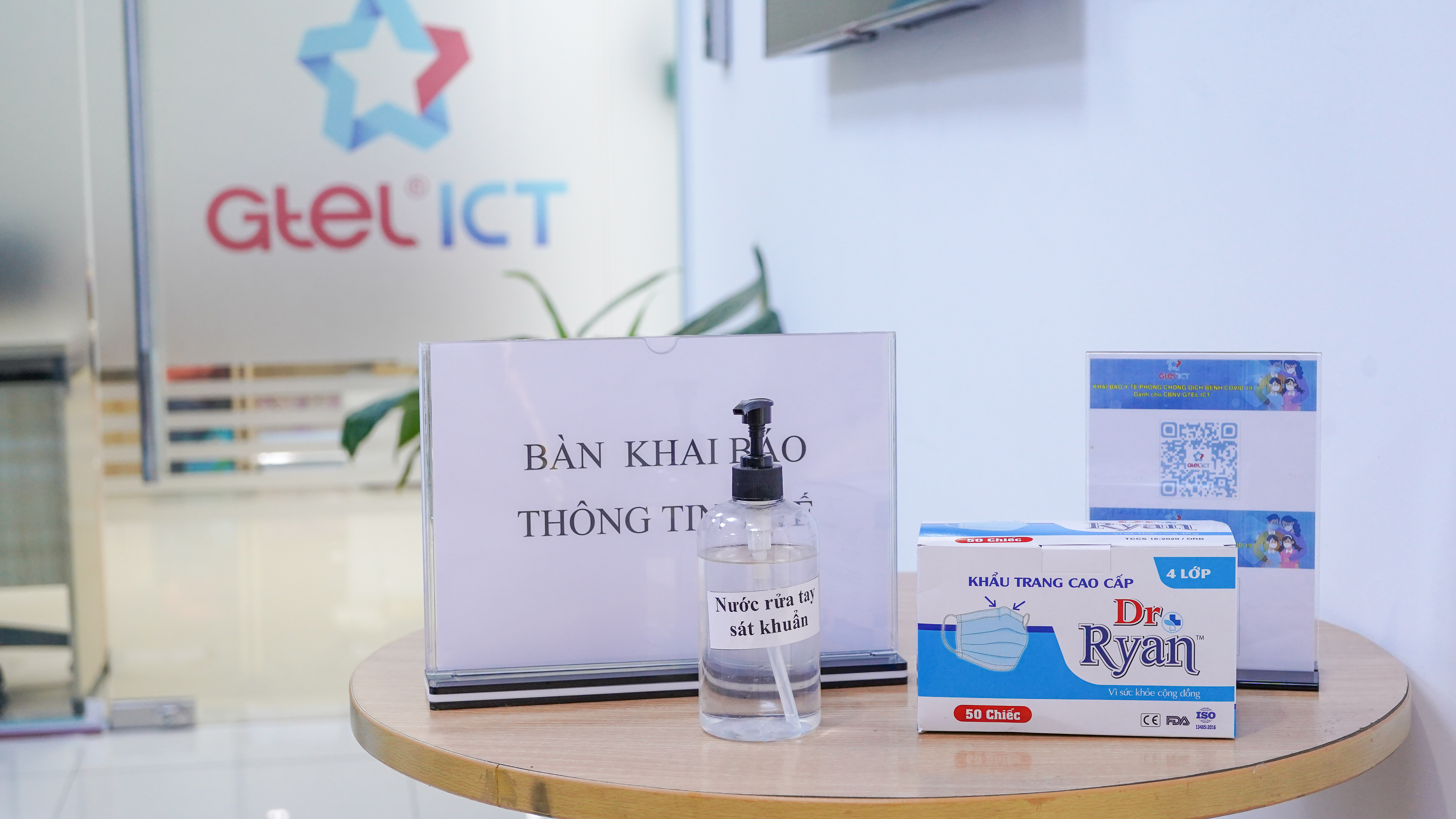 Trước những diễn biến phực tạp của dịch Covid 19 trên thế giới nói chung và tại nước ta nói riêng, Ban lãnh đạo của Công ty GTEL ICT đã có những chỉ đạo sát sao, tích cực trong công tác phòng chống dịch tại nơi làm việc. Mỗi cán bộ, nhân viên, khách mời khi đến công ty đều phải quét mã QR code thực hiện khai báo Y tế đầy đủ, đo thân nhiệt, rửa tay sát khuẩn và đảm bảo đeo khẩu trang 100% cũng như giữ khoảng cách an toàn với đồng nghiệp.
